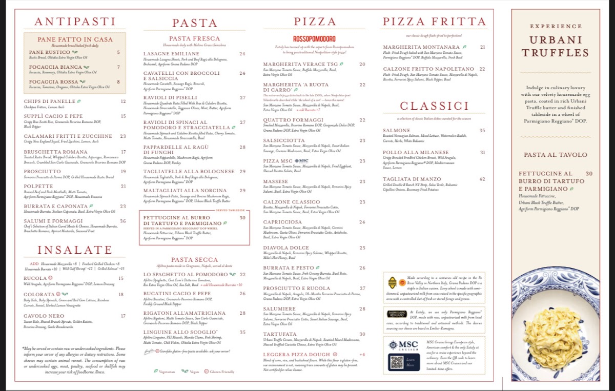 The menu is a true testament to Italian cuisine, featuring an impressive array of appetizers, salads, paninis, and more. Savor the divine Focaccia Bianca, perfectly paired with Olitalia Extra Virgin Olive Oil, or indulge in the Mortadella E Pistacchio, a decadent combination of Rovagnati Mortadella and pistachio pesto on toasted sourdough bread. For a refreshing start, try the Insalata Di Rucola, where wild arugula dances with heirloom tomatoes and Grana Padano DOP under a zesty lemon dressing.